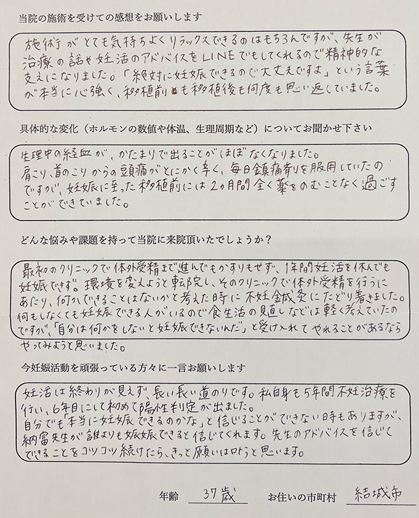 最初は、顕微授精で受精しなかった、絶望的な状況でお世話になりました。何か、出来れば、体質改善になればと思い、来ました。